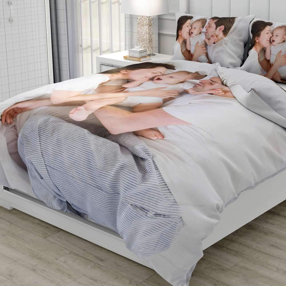 お気に入りの写真を使用して、カスタムコンフォーター、パーソナライズされたシーツ、フォトブランケット、カスタム枕カバーを備えたカスタムベッドルームを作成します。
