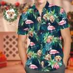 クリスマスギフト 顔付きカスタムアロハシャツ カスタムドッグフェイスシャツ 葉とフラミンゴのボタンダウンシャツ