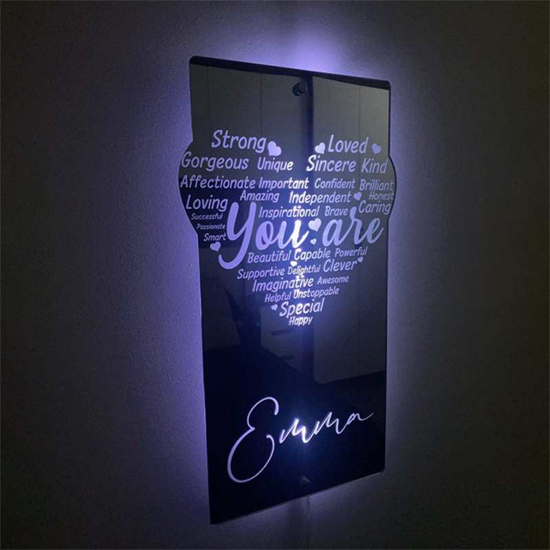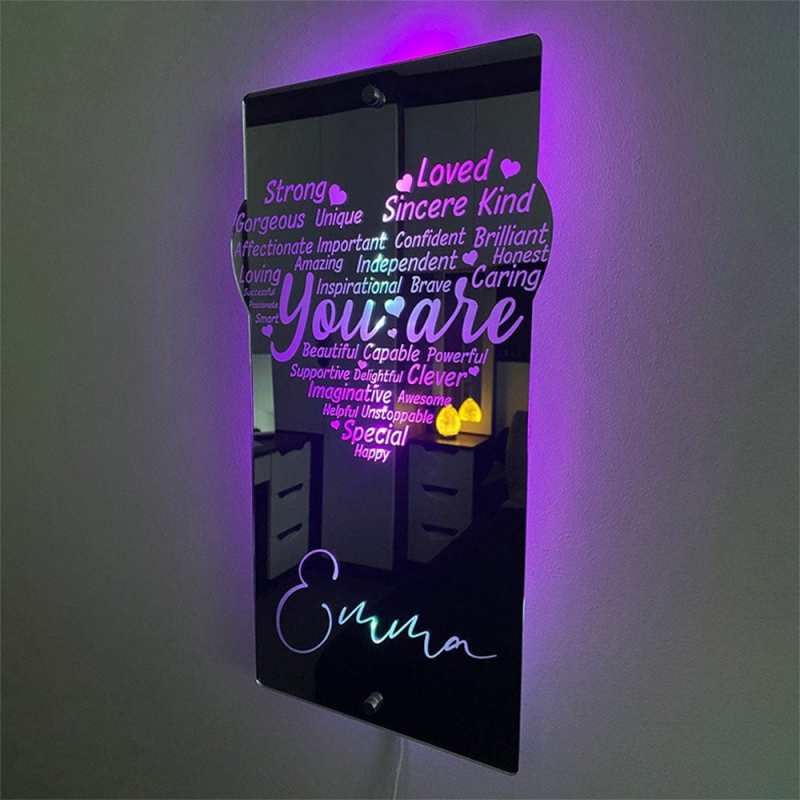 - This super stylish personalised name mirror with LED lighting is a perfect and unique edition to any youngsters bedroom, they will love lighting up the personalised mirror and seeing their own name in lights.This eye-catching personalised name mirror makes the perfect gift for 2023 and it will be cherished and loved for many years to come by the recipient.Includes remote control for LED lighting and chrome wall mounting stand offs.
