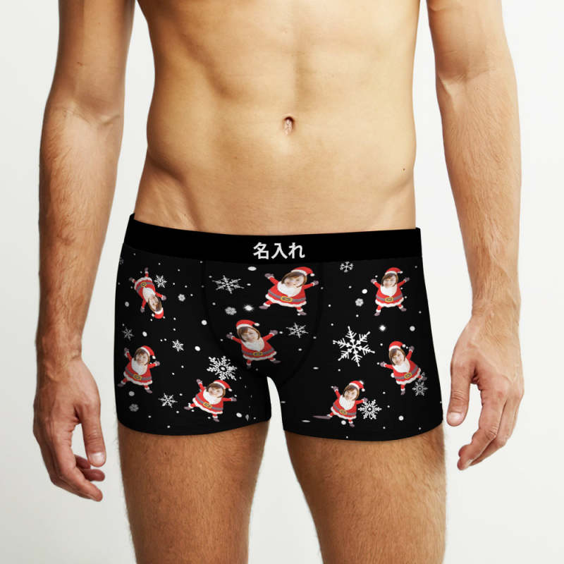 カスタム顔ボクサーパンツ-顔の写真入れ可能なオリジナルフォト下着ショーツクリスマスギフト-雪柄と可愛いサンタ