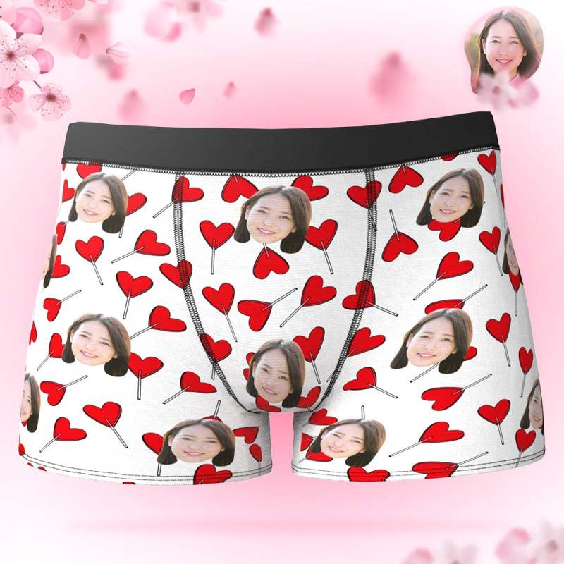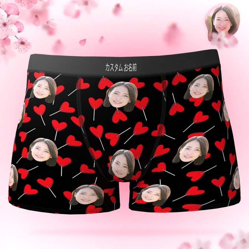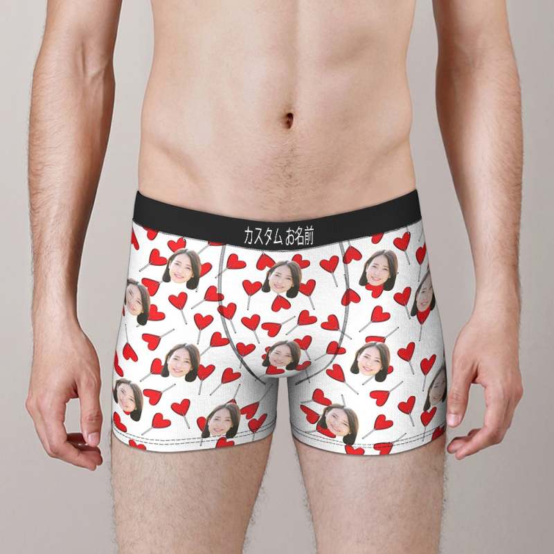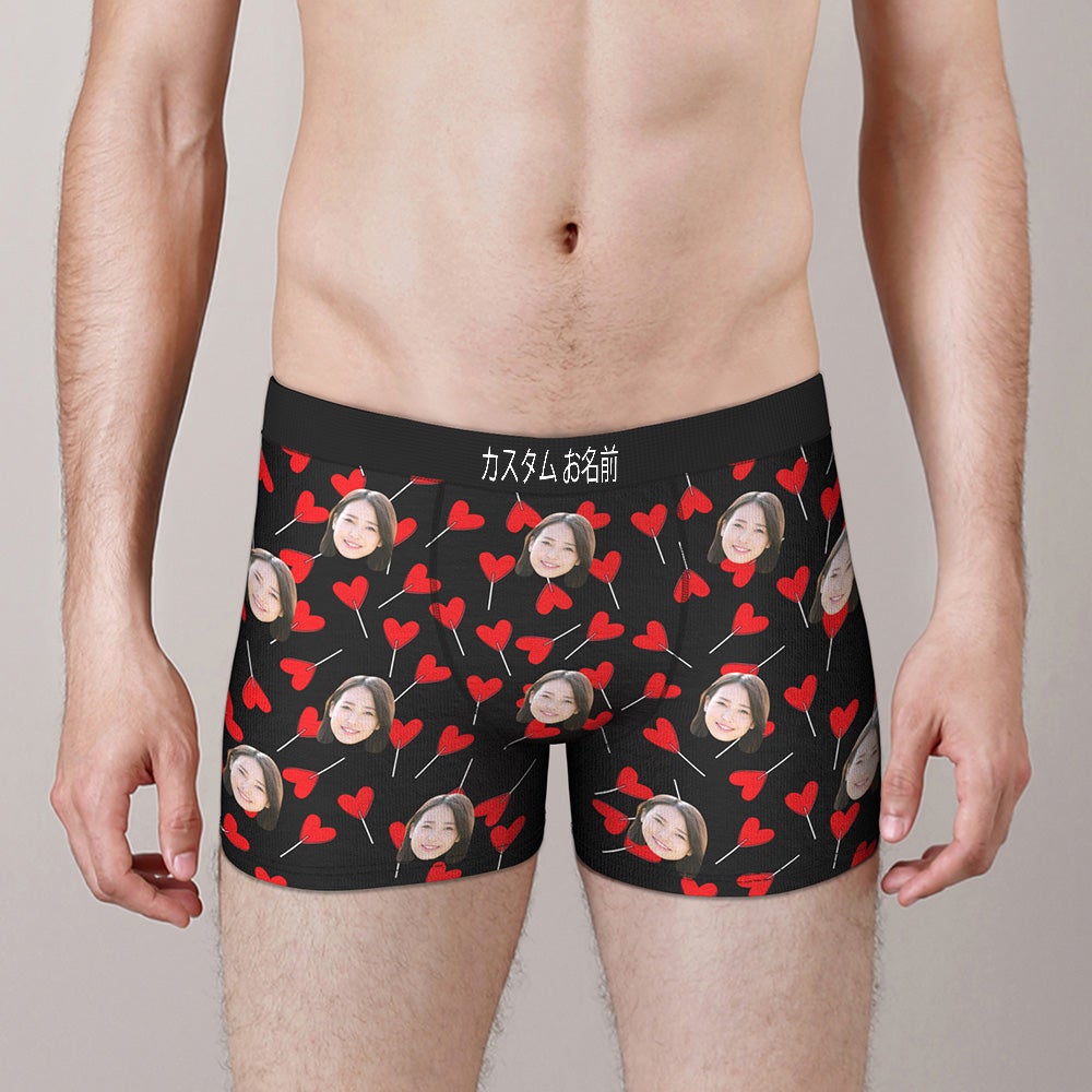 カスタムフォトボクサーパンツ-写真とテキスト入り可能なキャンデーハート柄の下着彼氏や旦那へのバレンタインギフト