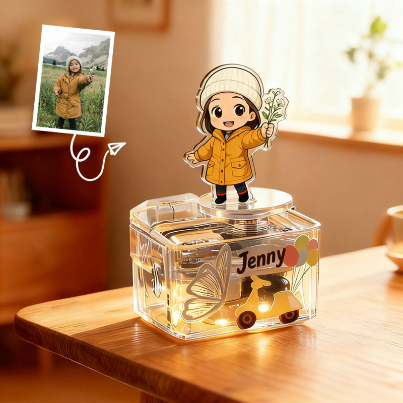このカスタムオルゴールは,アップロードした写真を愛らしい漫画風のフィギュアに変身させ,360度回転する滑らかな台座にディスプレイします.音楽が流れると,小さなカップル/キャラクターが優しく回転し,あなたの思い出を最高に素敵な方法で蘇らせます.