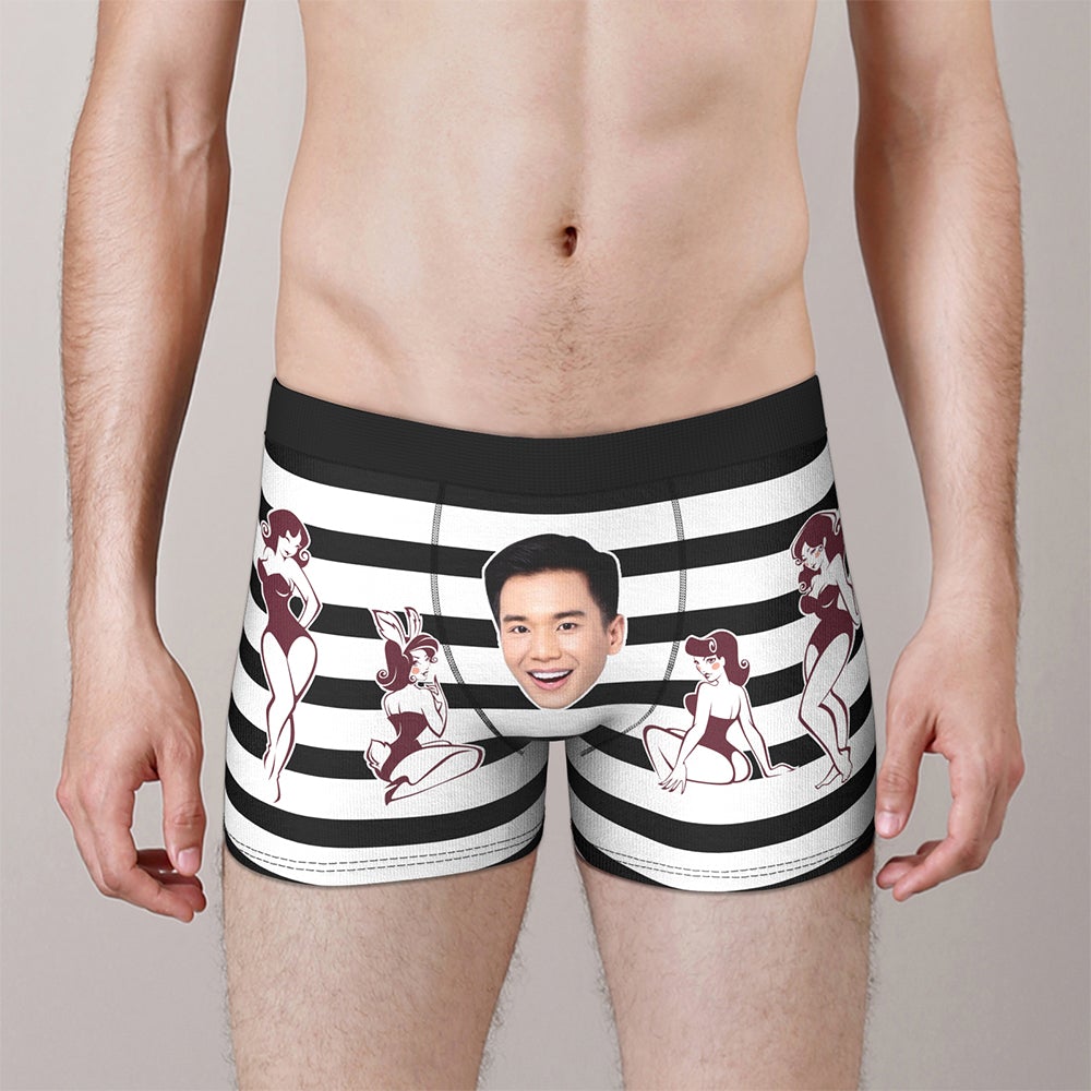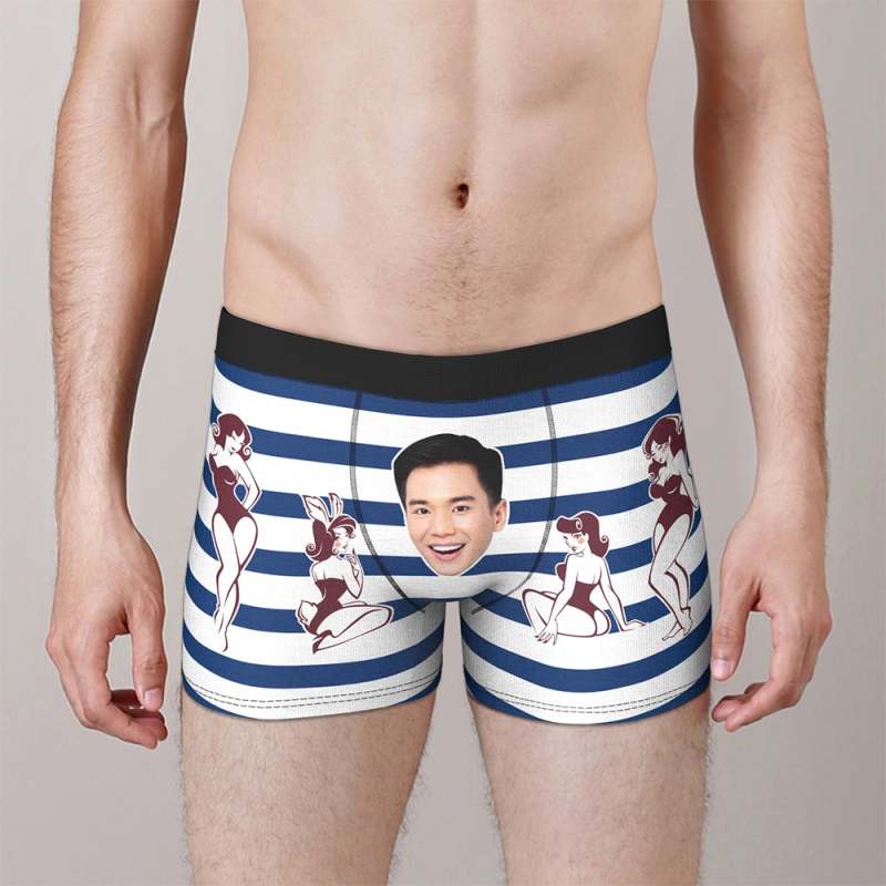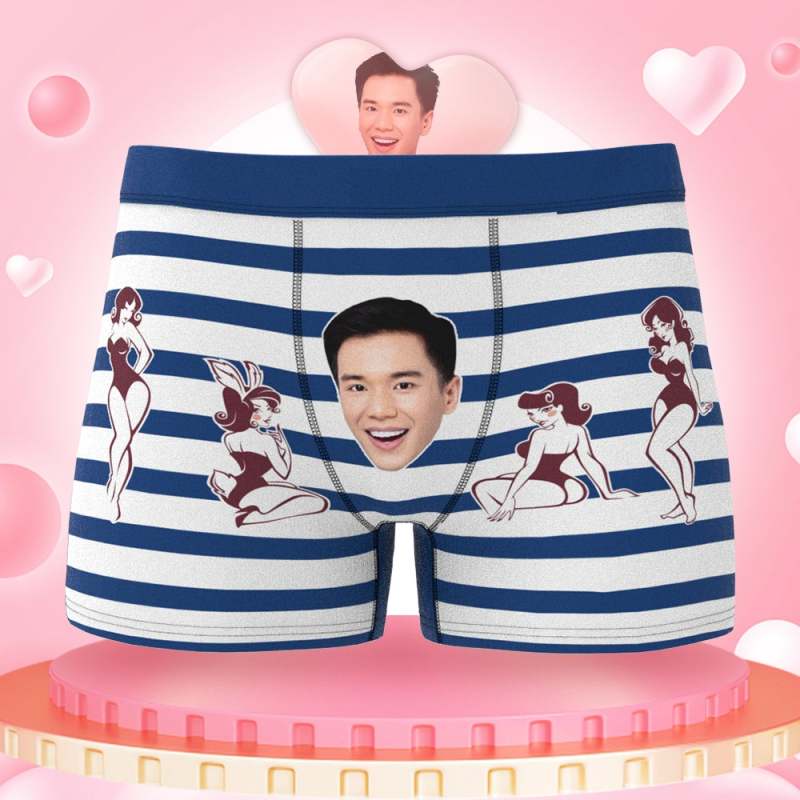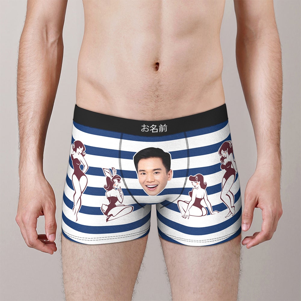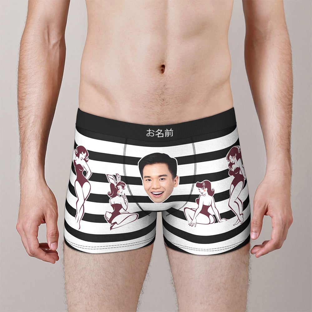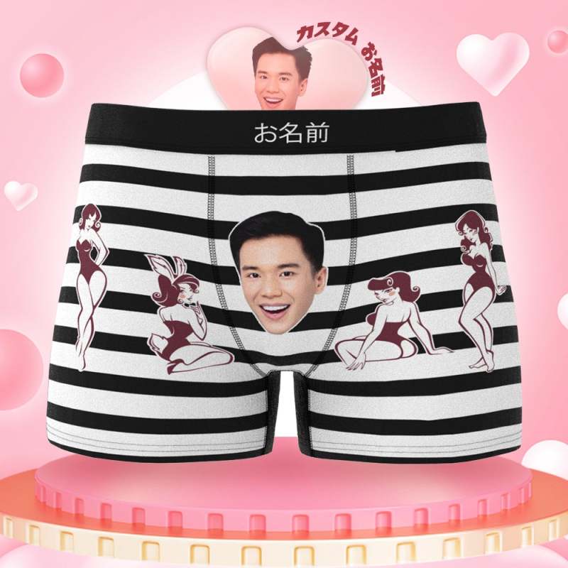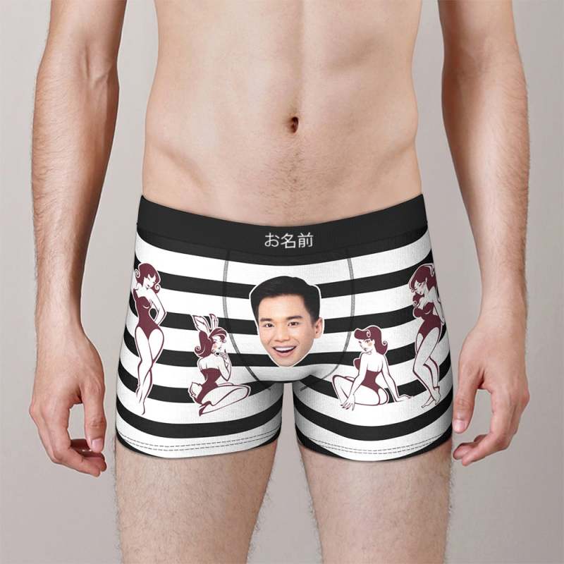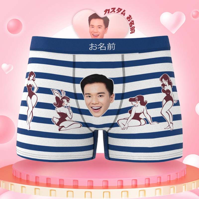 カスタムフォトボクサーパンツ-写真とテキスト入り可能なストライプと女の子柄のオリジナル下着バレンタインプレゼント