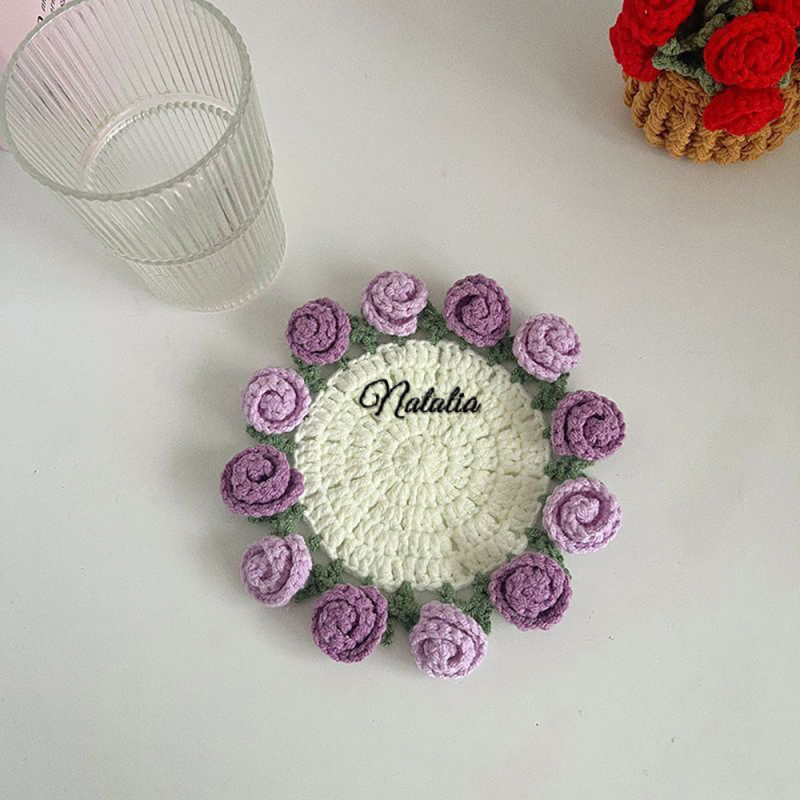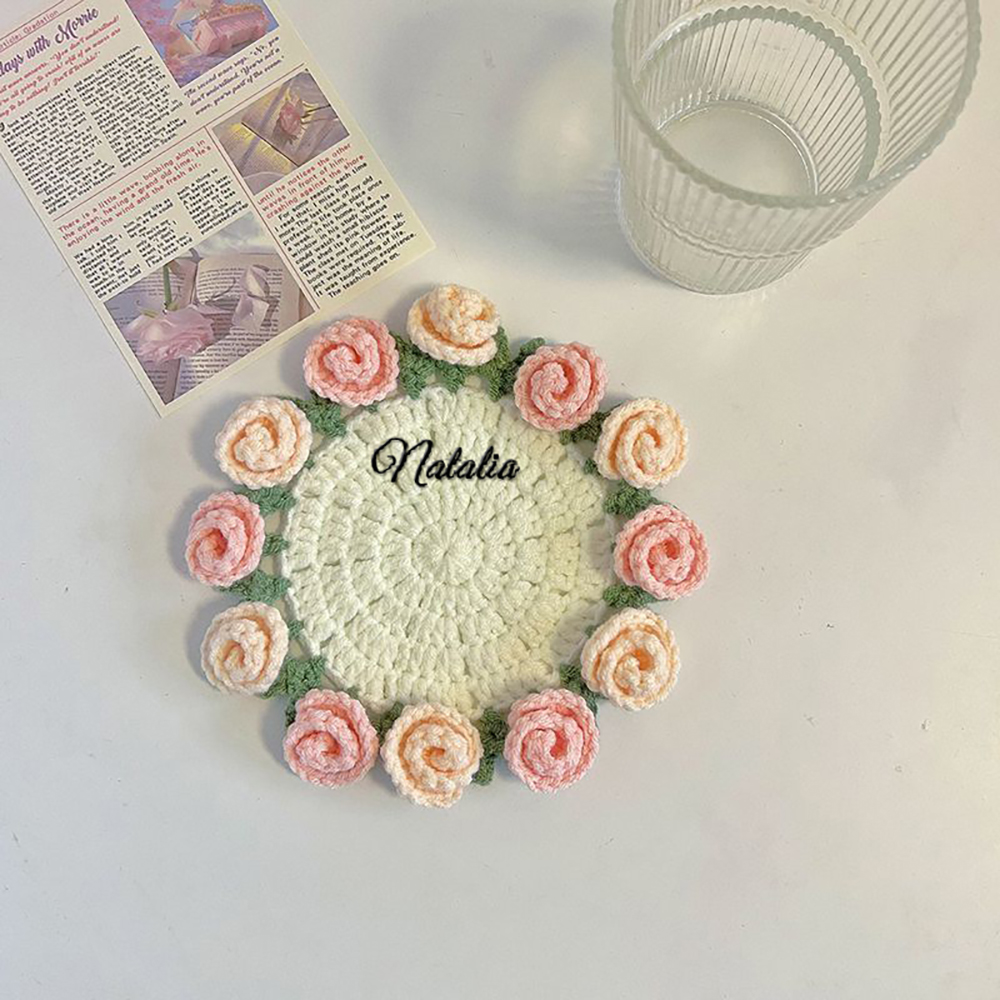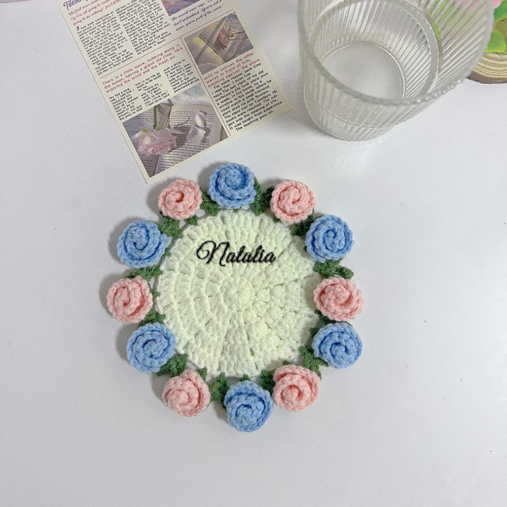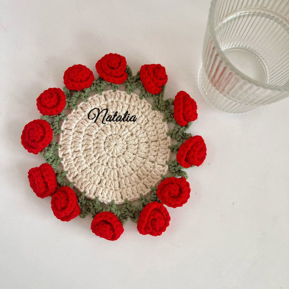 カスタマイズされた名前のコースタークリエイティブギフトブーケかぎ針編みのカップ完成したバラの花束手作りの手持ちの花織りコースター