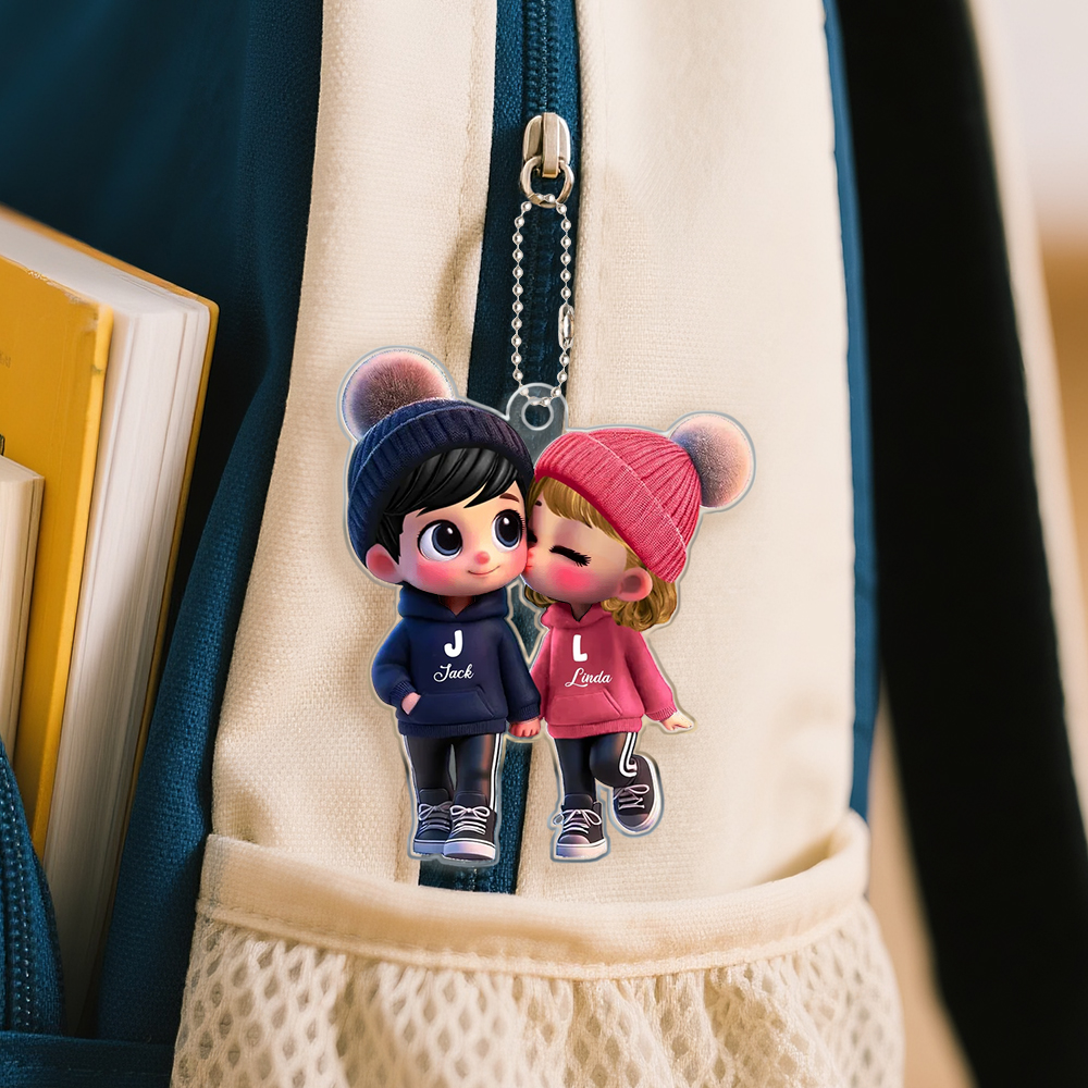 パーソナライズされたアクリル製カーハンガー - かわいいカップルのキスシーン - ボーイフレンドとガールフレンドへのカスタムネームギフト