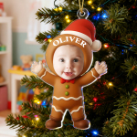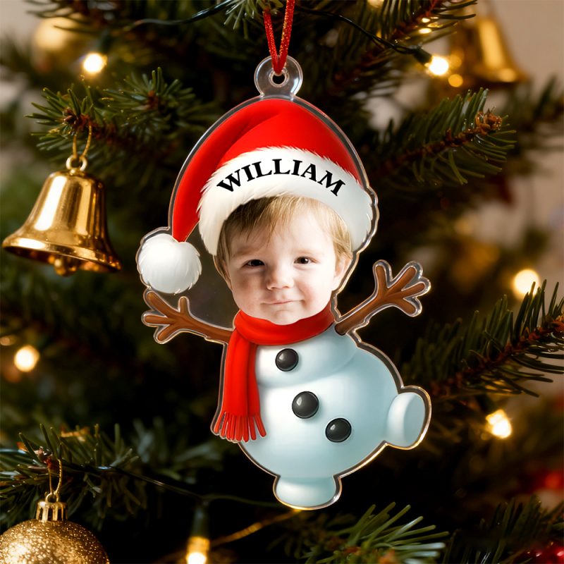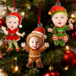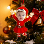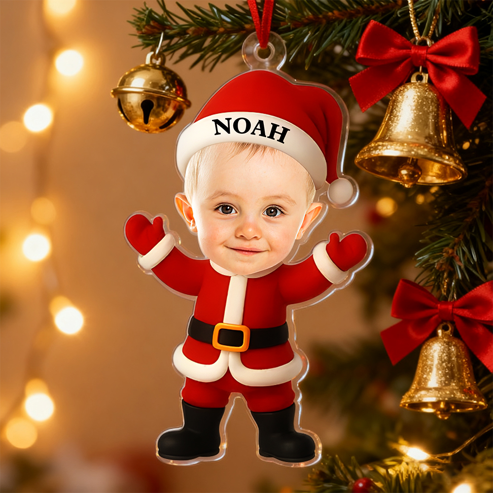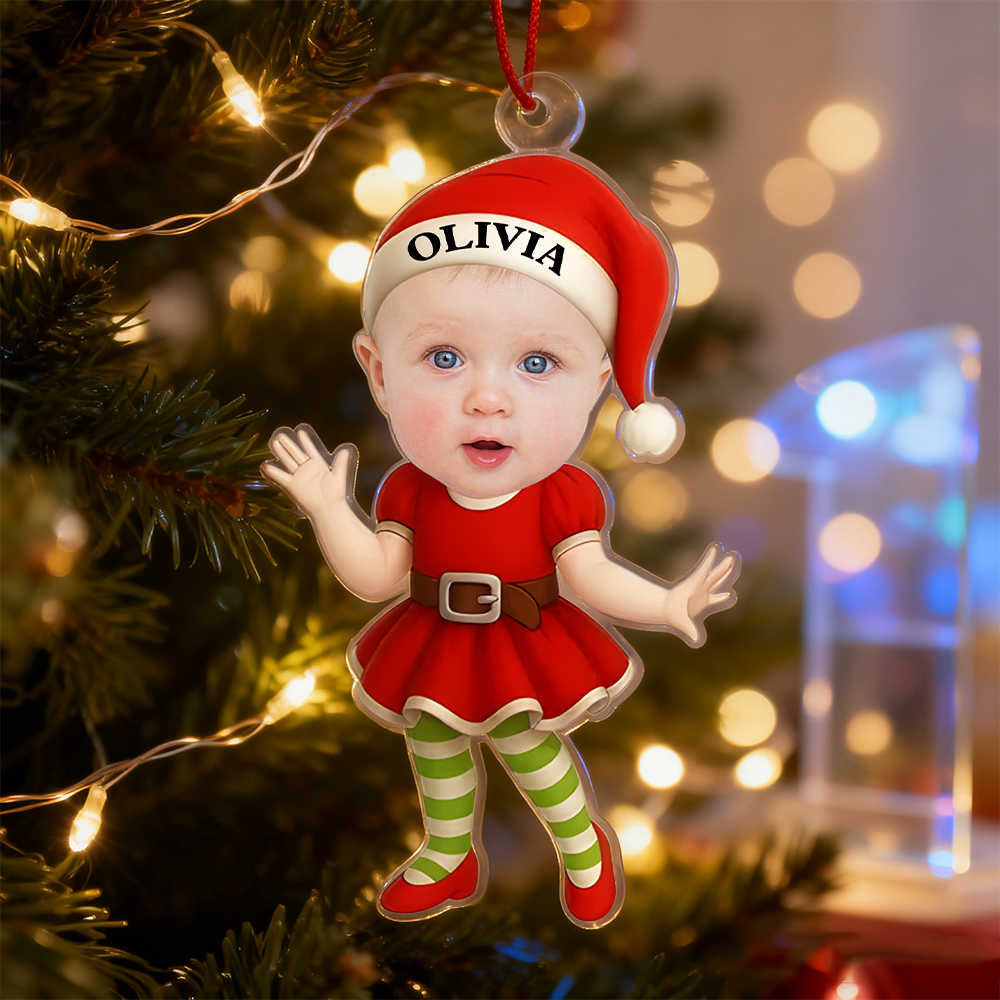 サンタ、ジンジャーブレッド、エルフの衣装をあしらったお祝いのデザインに、赤ちゃんの写真と名前をあしらったこのオーナメントは、ホリデーシーズンの喜び、笑い、驚きを表現しています。