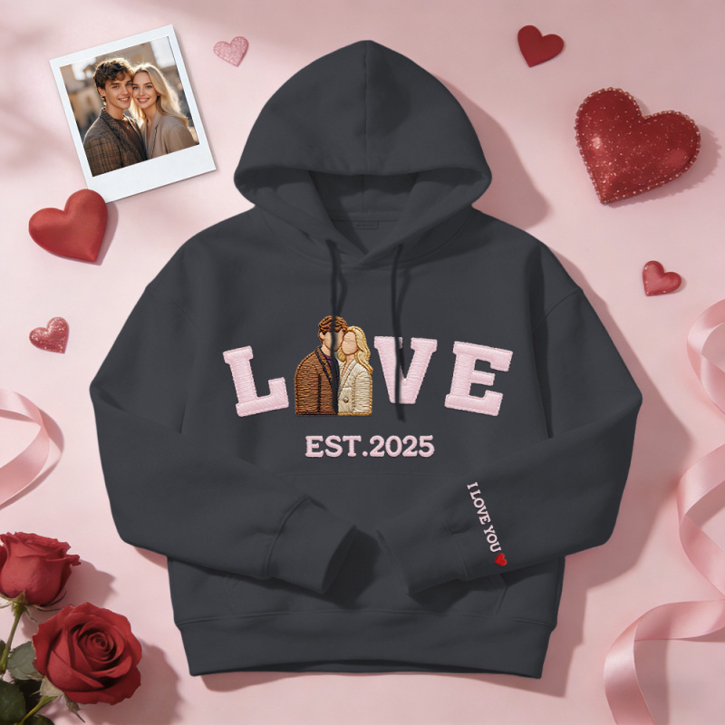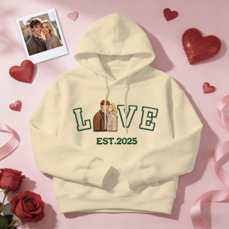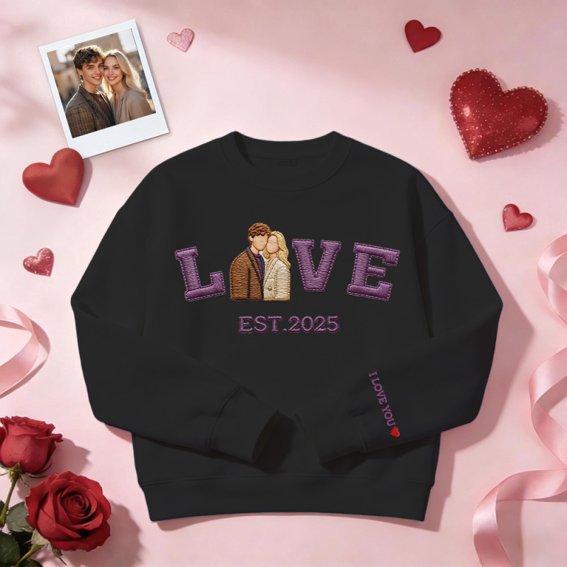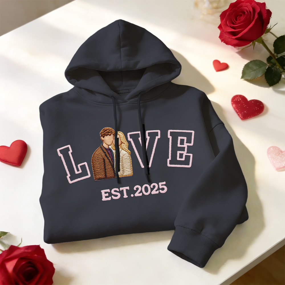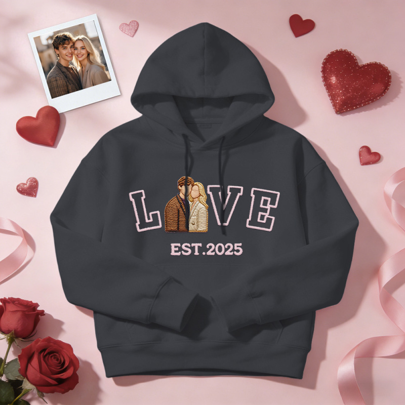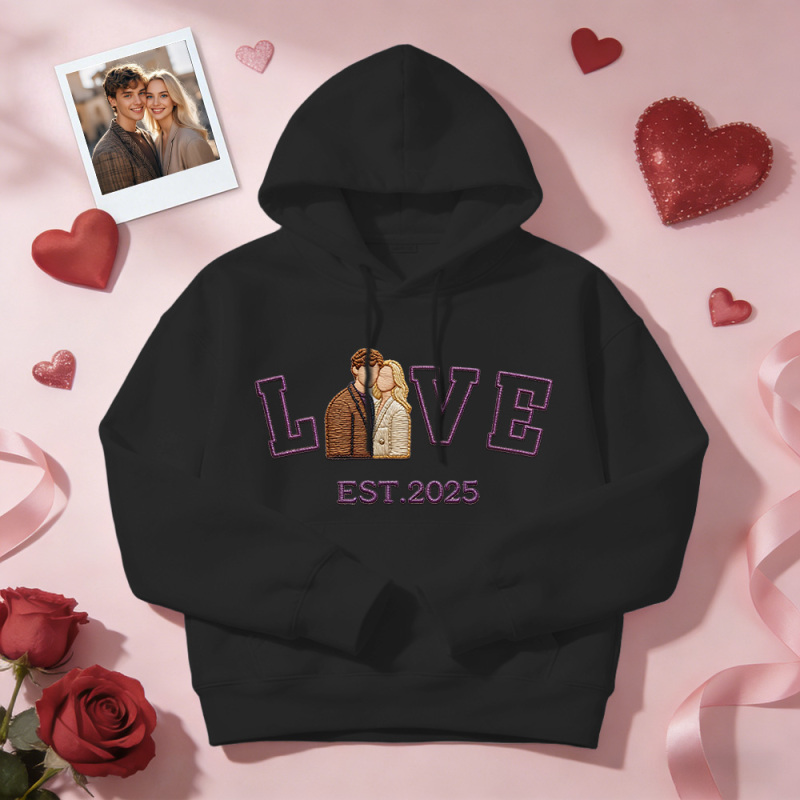 あなたの愛を,お気に入りの写真から時代を超えた刺繍デザインをデザインした,パーソナライズされたカップル向けスウェットシャツまたはパーカーで表現しましょう.カスタムカップルポートレート,ロマンチックなLOVEのメッセージ,そして特別なEST年をあしらったこのアイテムは,大切な瞬間をさりげなく,そして永遠に記憶に残る形で表現します.