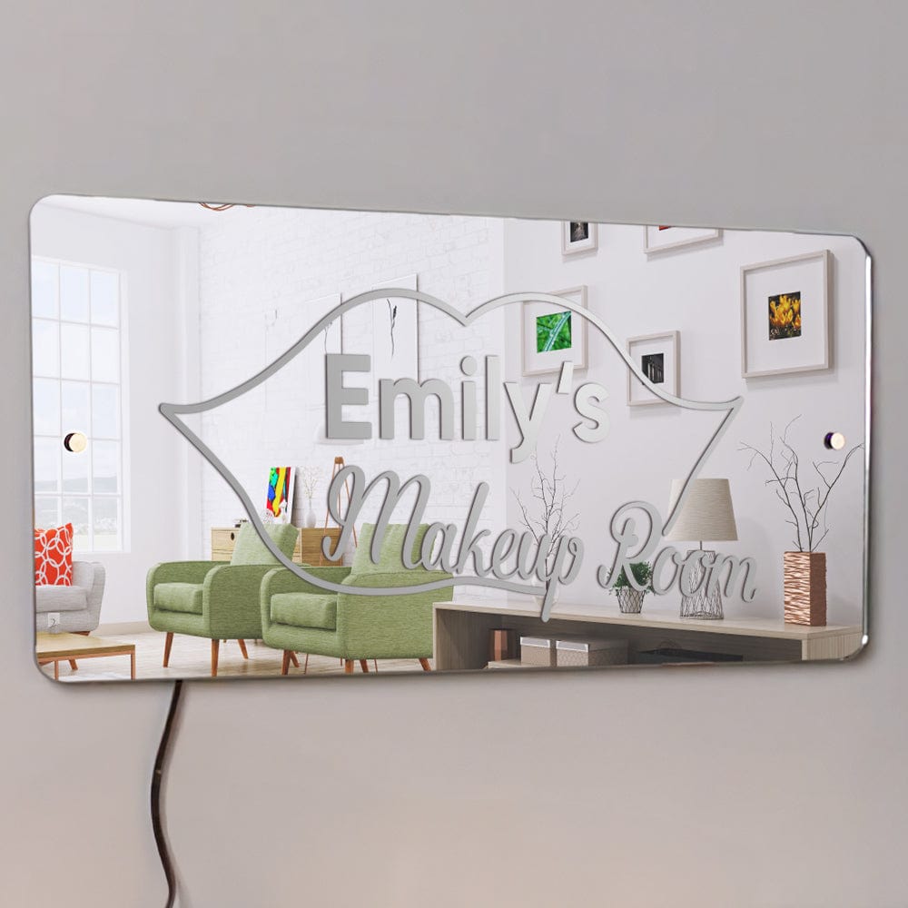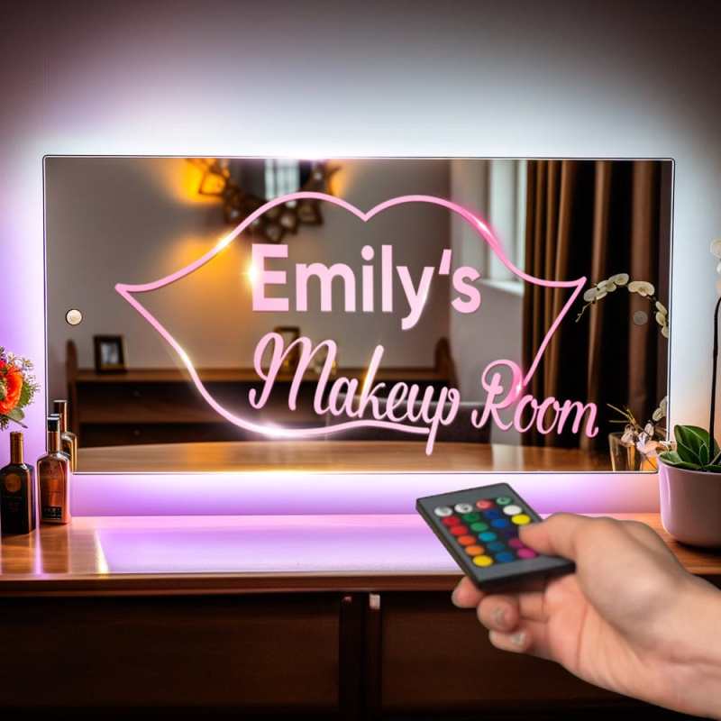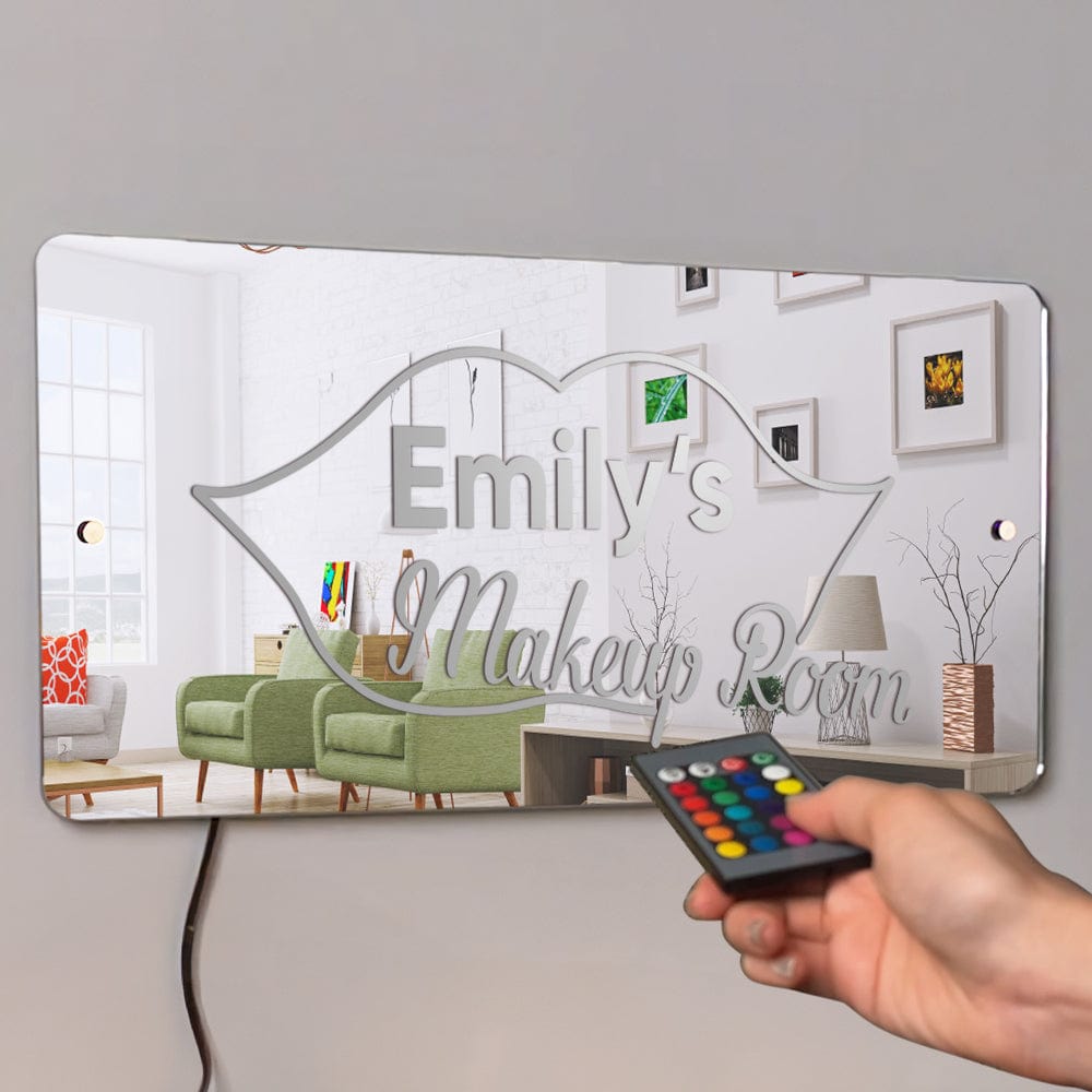 - This super stylish personalized name mirror with LED lighting is a perfect and unique addition to any youngster's bedroom, they will love lighting up the personalised mirror and seeing their name in lights. This eye-catching personalized name mirror makes the perfect gift for 2023 and it will be cherished and loved for many years to come by the recipient. Includes remote control for LED lighting and chrome wall mounting stand-offs.