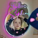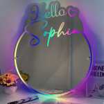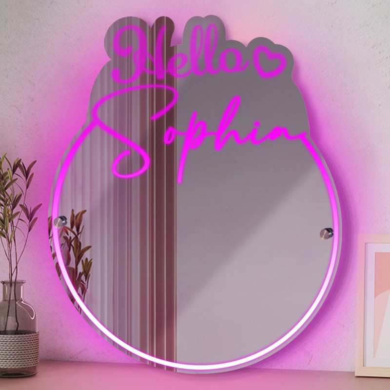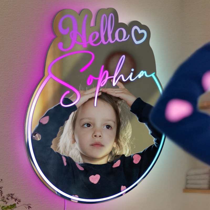 - This super stylish personalised name mirror with LED lighting is a perfect and unique edition to any youngsters bedroom, they will love lighting up the personalised mirror and seeing their own name in lights.This eye-catching personalised name mirror makes the perfect gift for 2023 and it will be cherished and loved for many years to come by the recipient.Includes remote control for LED lighting and chrome wall mounting stand offs.