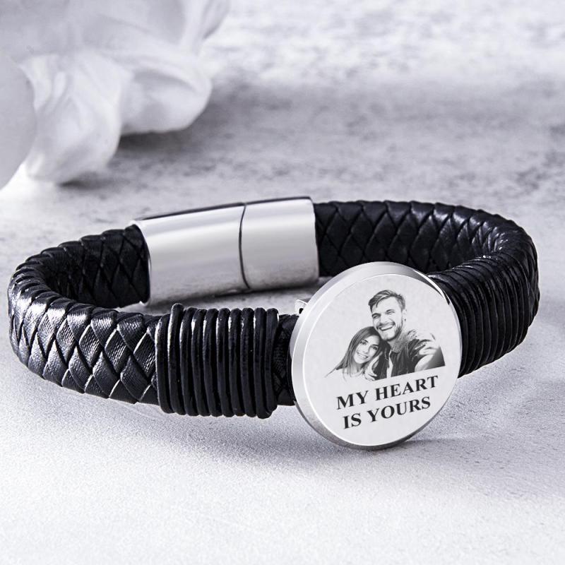 彼のためのパーソナライズされた写真の革の広いブレスレットの刻まれたユニークなブレスレットの贈り物