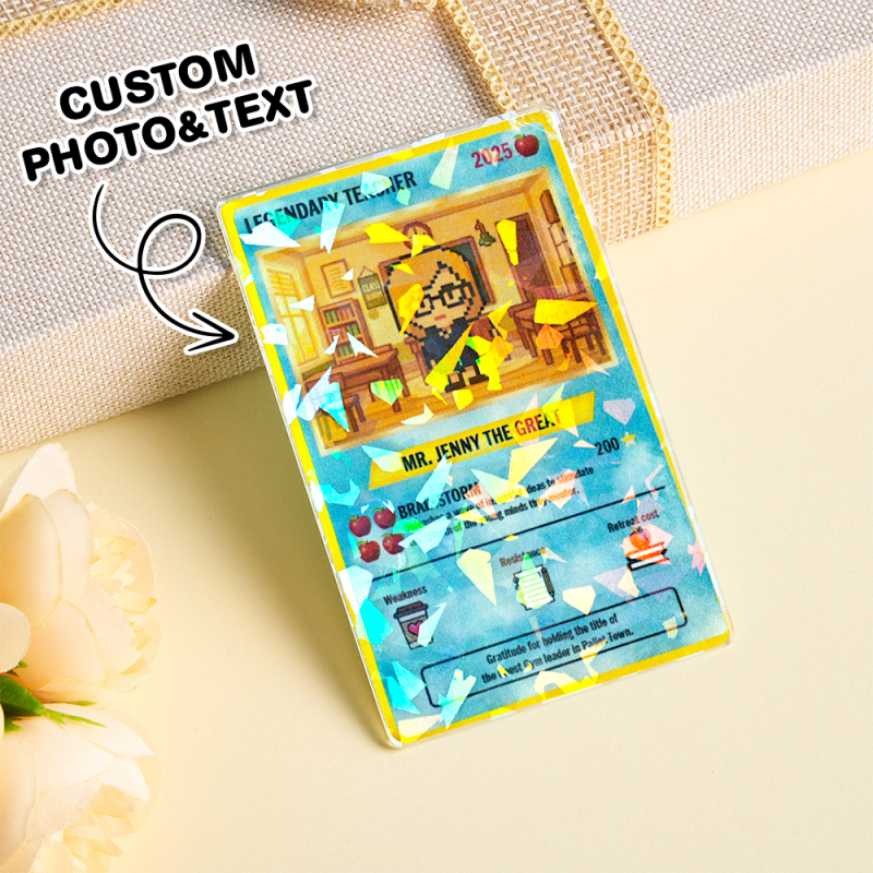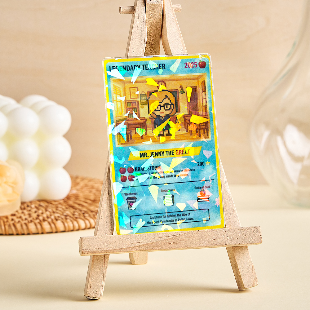 愛する人への完璧な贈り物です。カスタムトレーディングカードのようにデザインされたこのユニークな記念品は、先生を独自のコレクションキャラクター、名前、パワー統計に変え、本当に忘れられないトリビュートになります。