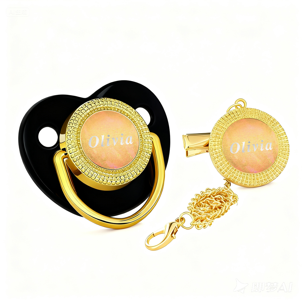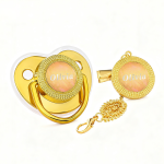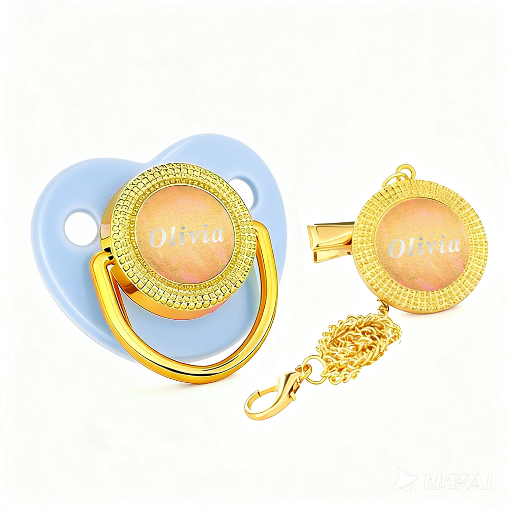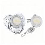 このパーソナライズされた高級おしゃぶり & クリップ セットで、小さなお子様にエレガントな雰囲気を添えましょう。ローズ ゴールドに美しいマザー オブ パールの象嵌が施されたこのセットは、赤ちゃんのおしゃぶりを安全に保ちながら洗練された雰囲気を演出します。おしゃぶりとクリップは赤ちゃんの名前でカスタマイズできるため、ユニークで特別な記念品になります。